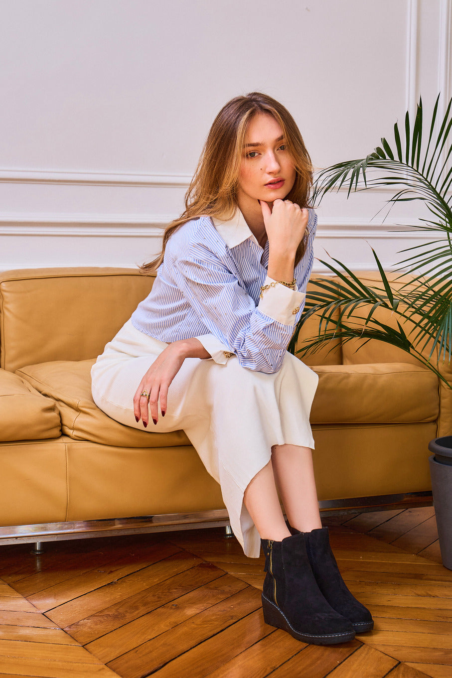 Alliez confort et style avec cette bottine en suédine compensée au design élégant et pratique. Confectionnée en matière synthétique douce au toucher, elle est dotée d’une fermeture éclair latérale pour un enfilage rapide et d’un talon compensé qui allonge la silhouette tout en restant agréable à porter toute la journée. Parfaite pour le bureau comme pour vos sorties, cette bottine est un essentiel chic de la saison.